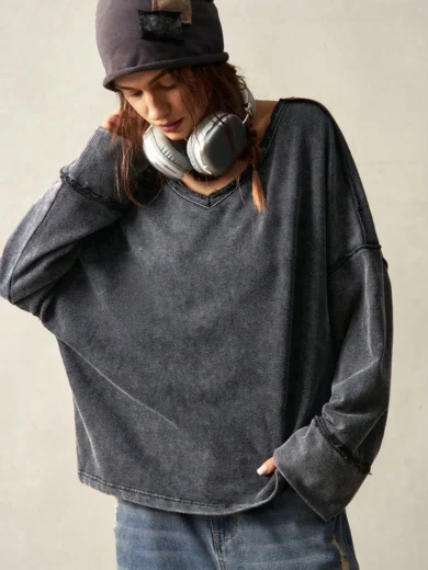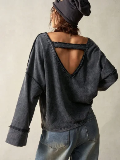 Women's V-Neck Backless Loose Sweatshirt with Flare Sleeves, Casual Long Sleeve Top