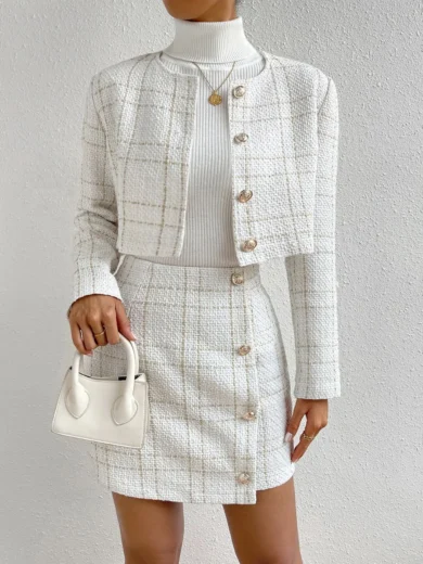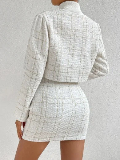 White Tweed Plaid Crop Jacket and Skirt Set with Gold Buttons