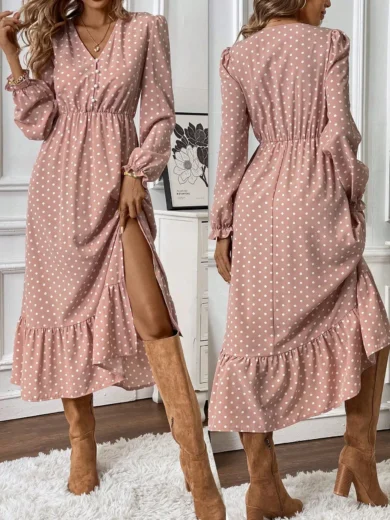 V-Neck Button-Up Long Sleeve Polka Dot Asymmetric Ruffle Hem Midi Dress