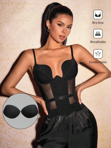 SXY Breast Cup Corset Top Women's Summer Solid Color Spliced Sheer Sexy Slim Fit Camisole Top