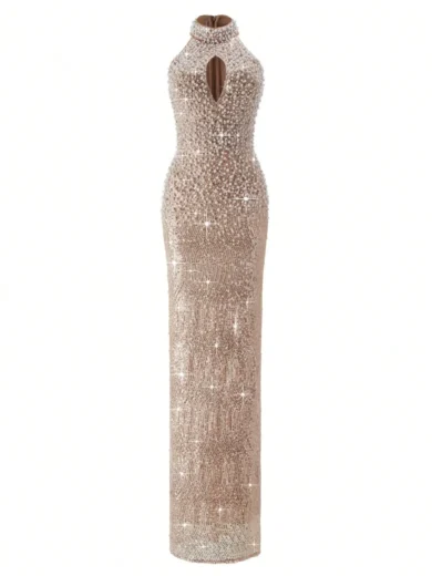 Pearl & Sequin Halter Neck Bodycon Evening Dress with Keyhole Cutout