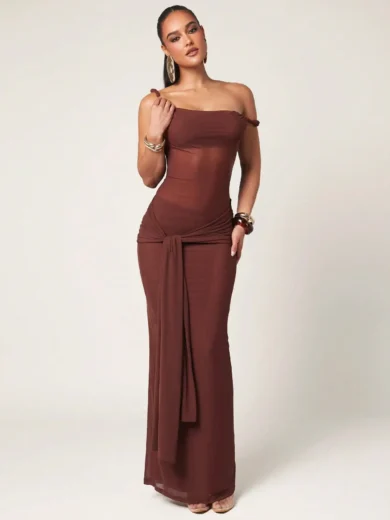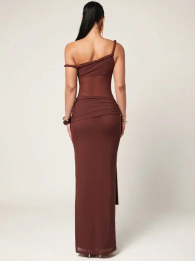 Silquee Women's Minimalist Solid Color Asymmetrical Neck Bodycon Dress, Summer Dress, Mesh Maxi Dress, One Shoulder