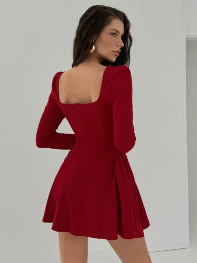 Solid Red Square Neck Long Sleeve A-Line Peplum Mini Dress
