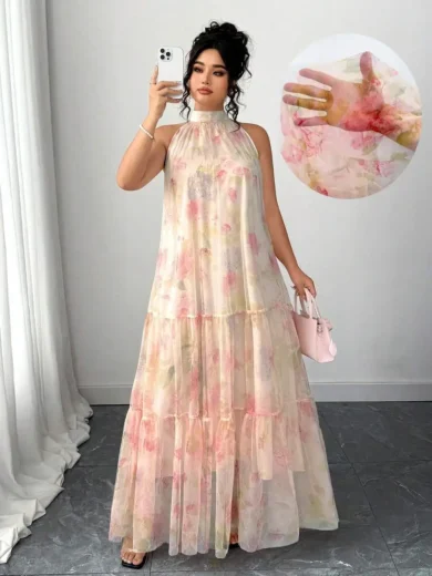 Plus Size Sleeveless Floral Chiffon Tiered Maxi Dress with High Neck