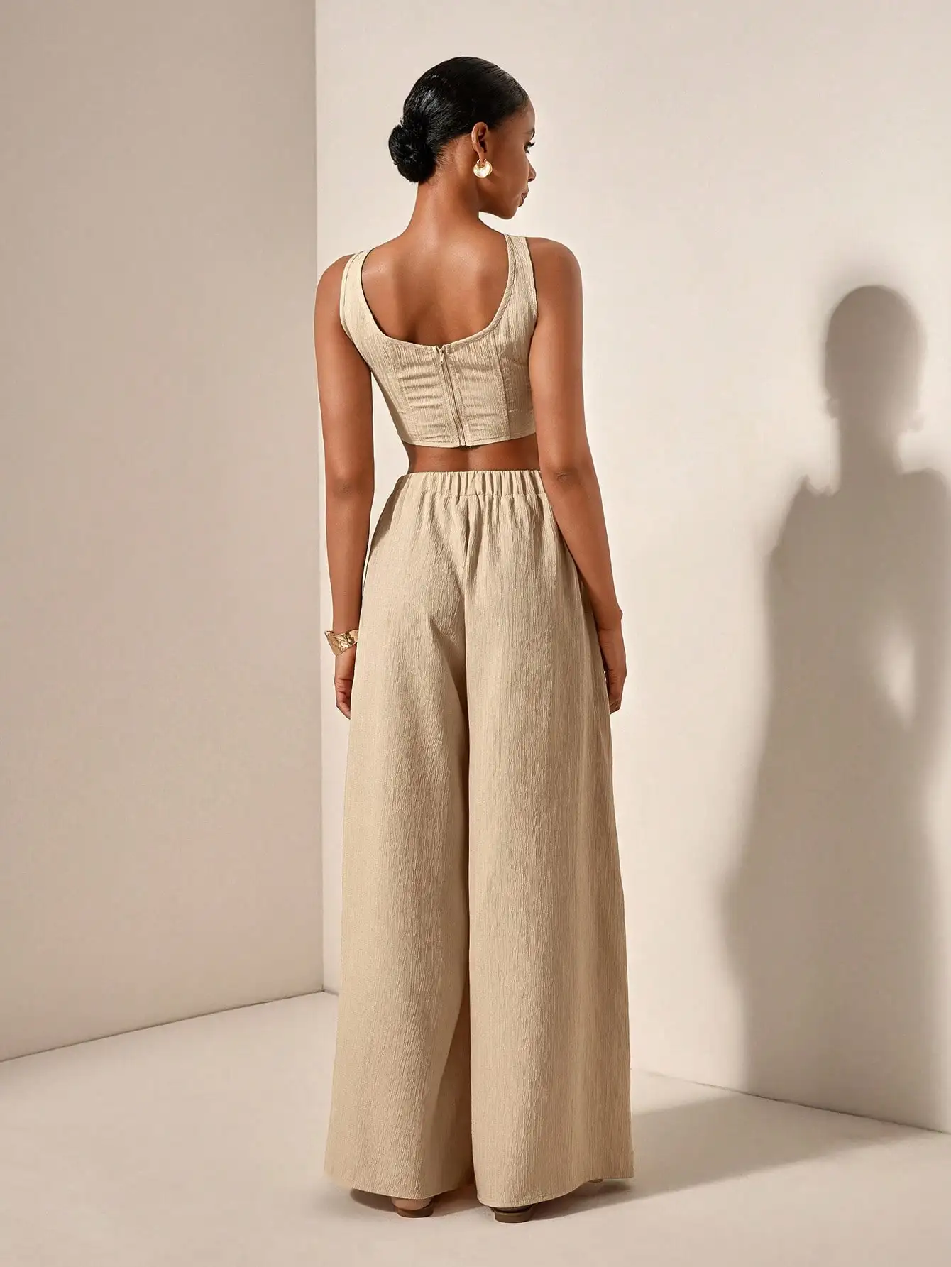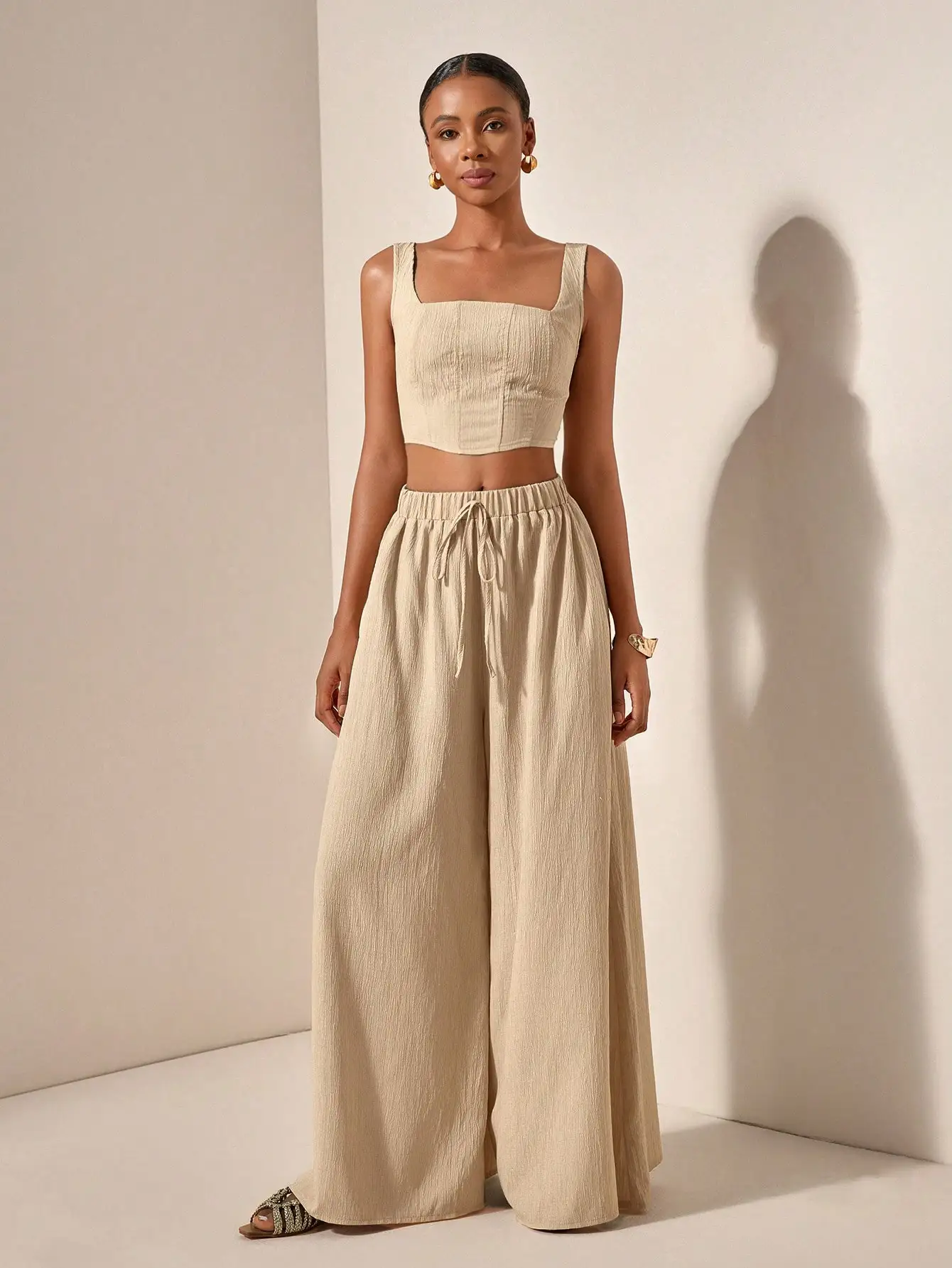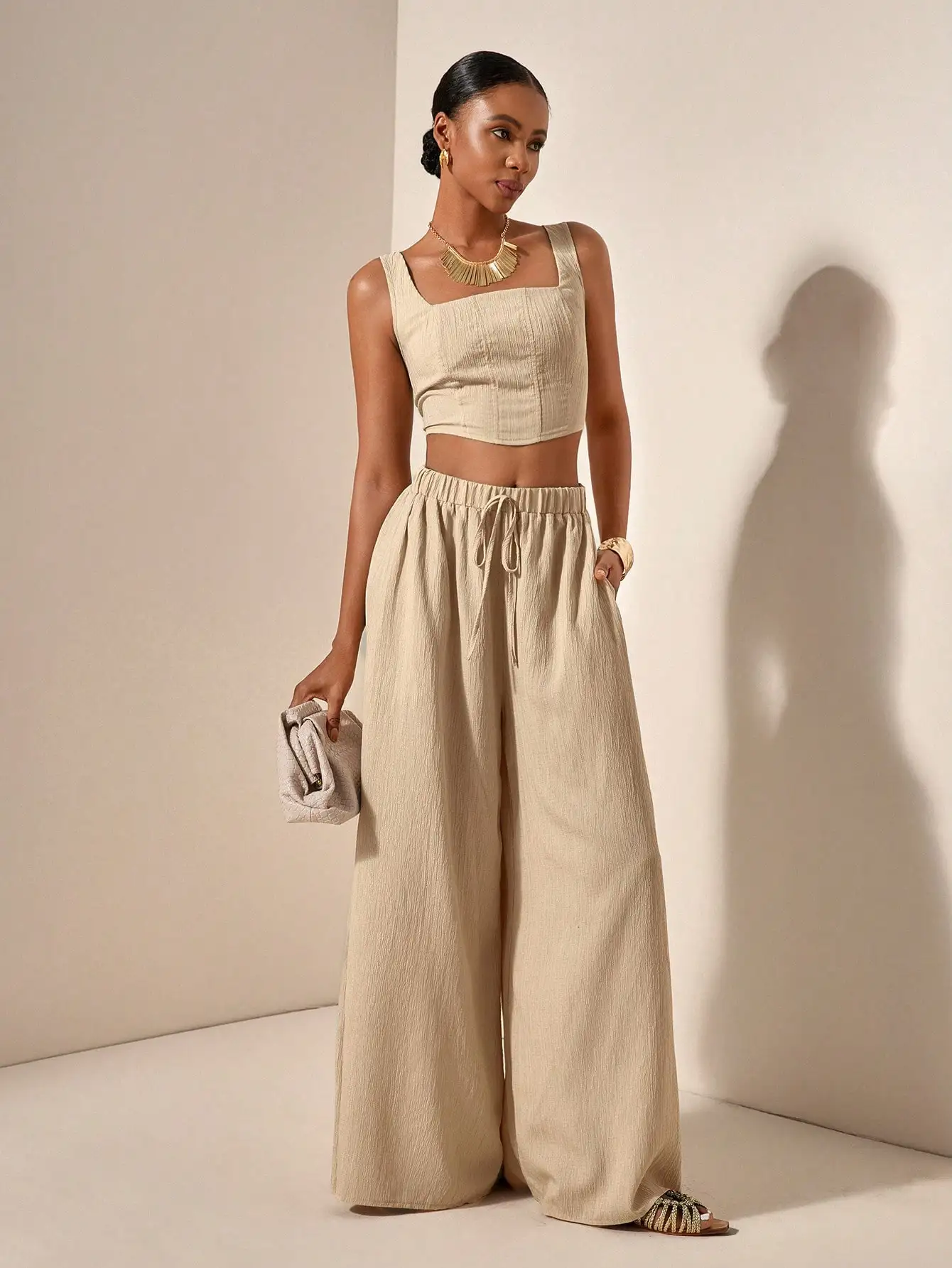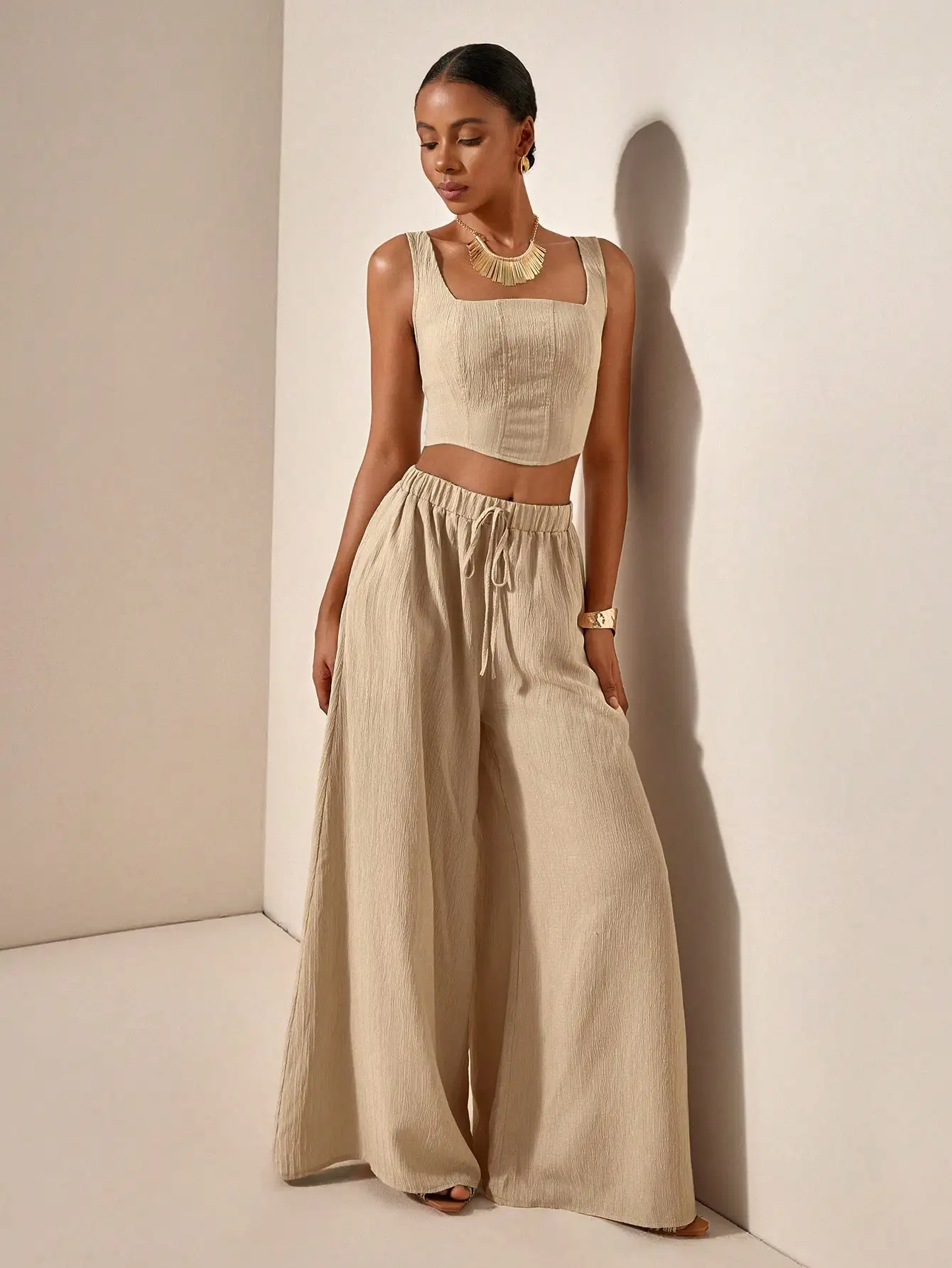 2025 Spring Summer Casual 2-Piece Set: Square Neck Crop Top & Wide Leg Pants with Pockets, Textured Fabric