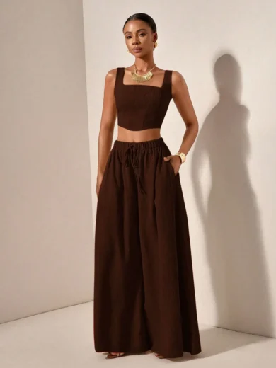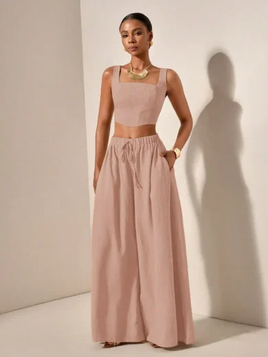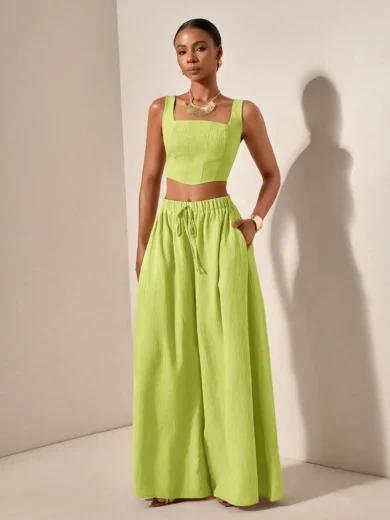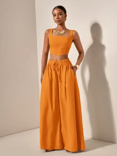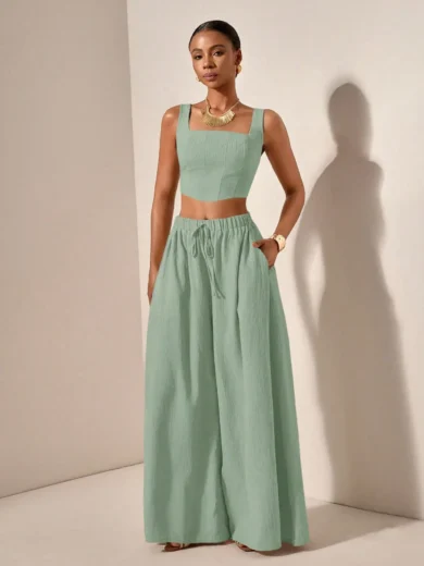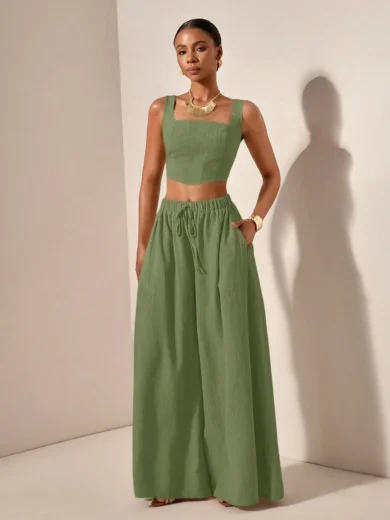 Be the first to review “2025 Spring Summer Casual 2-Piece Set: Square Neck Crop Top & Wide Leg Pants with Pockets, Textured Fabric”