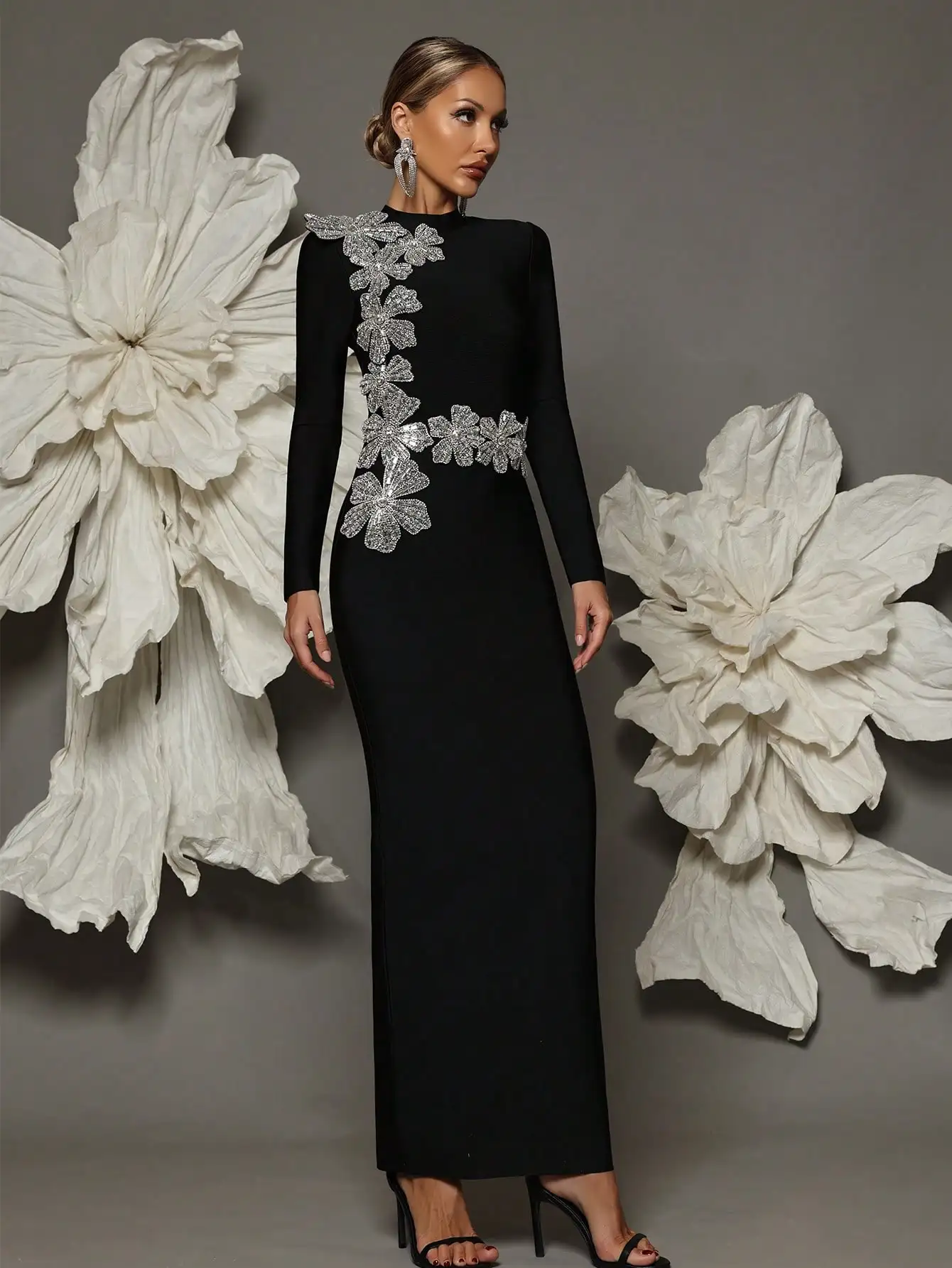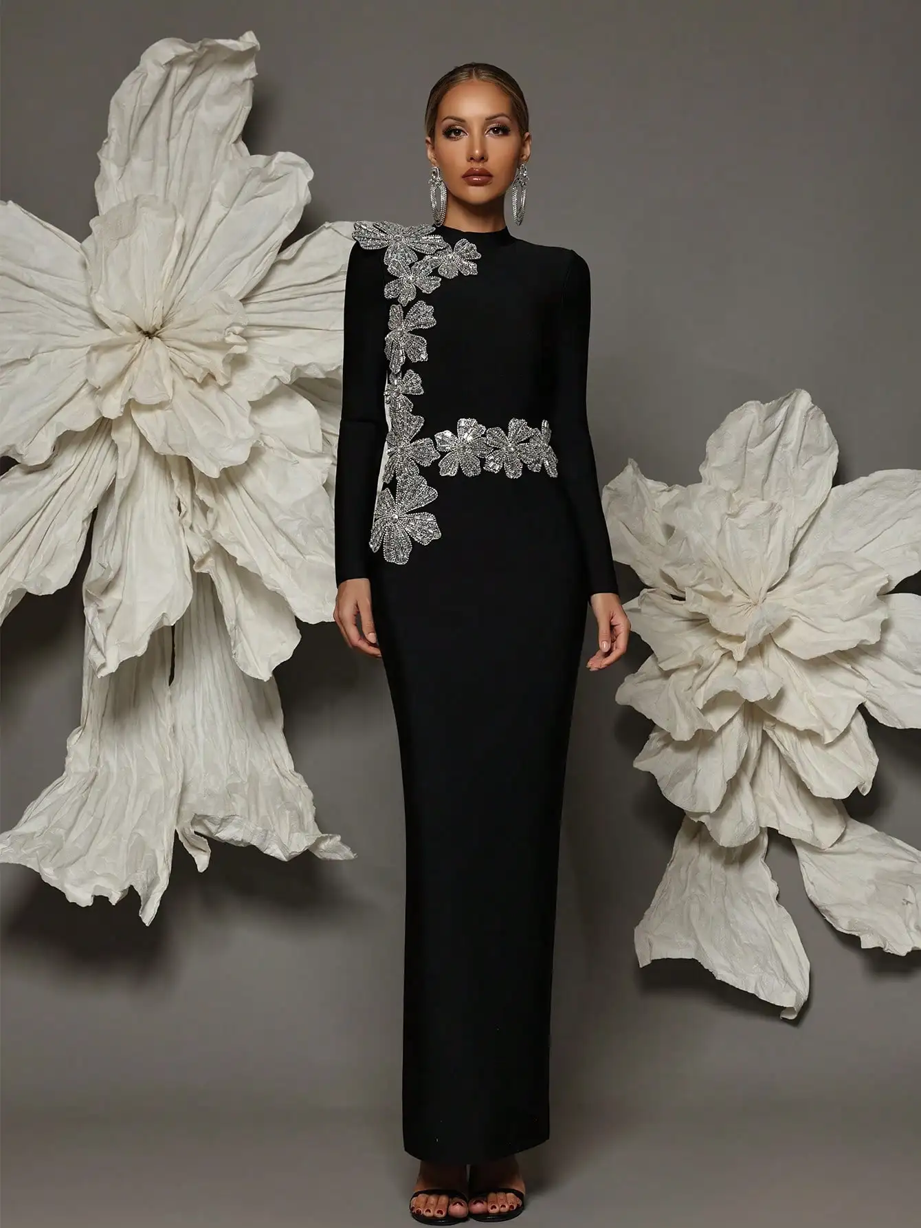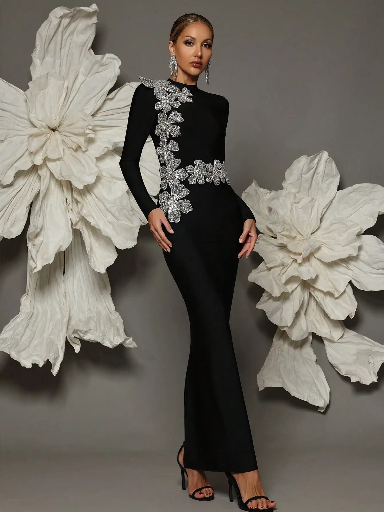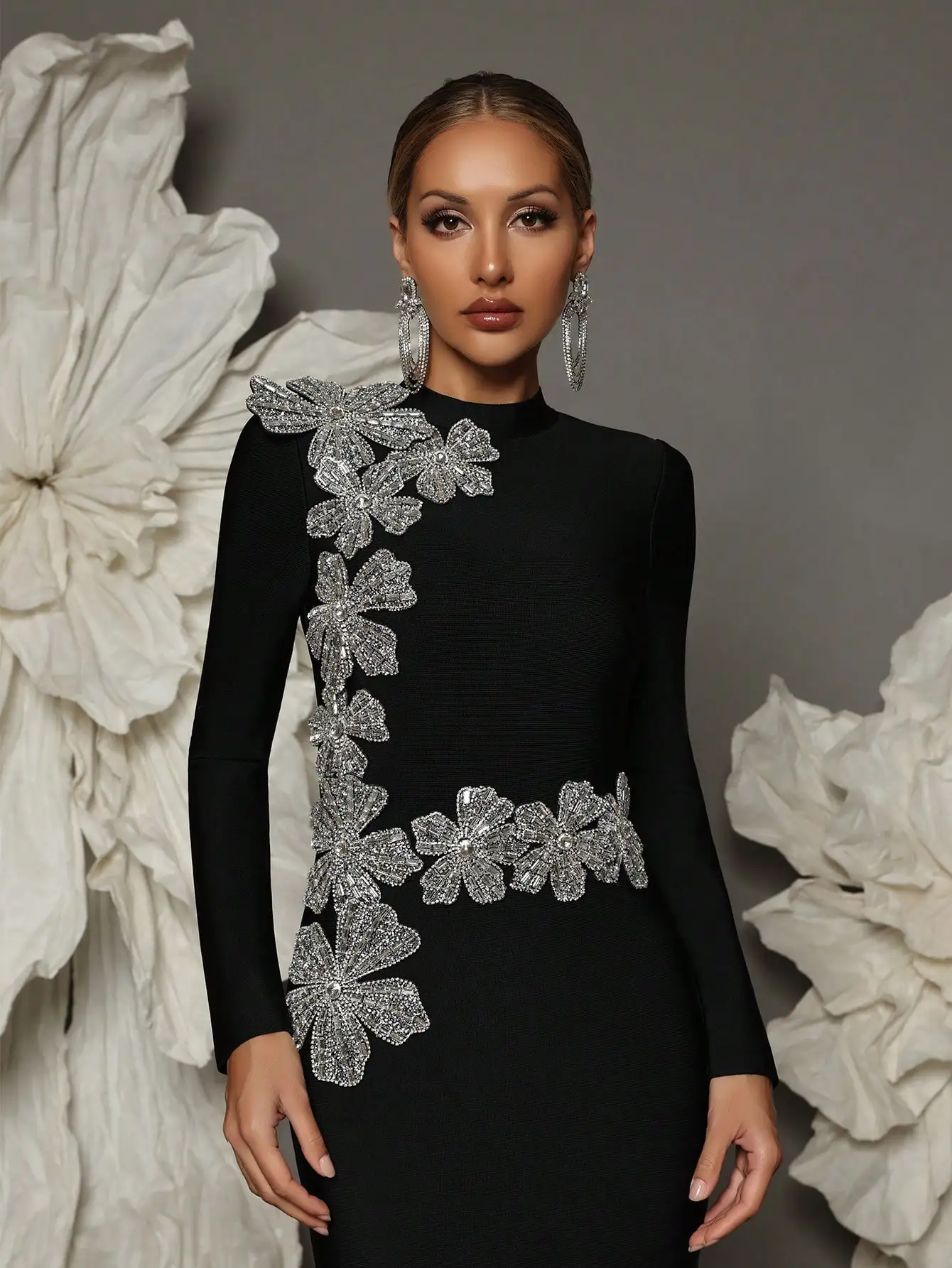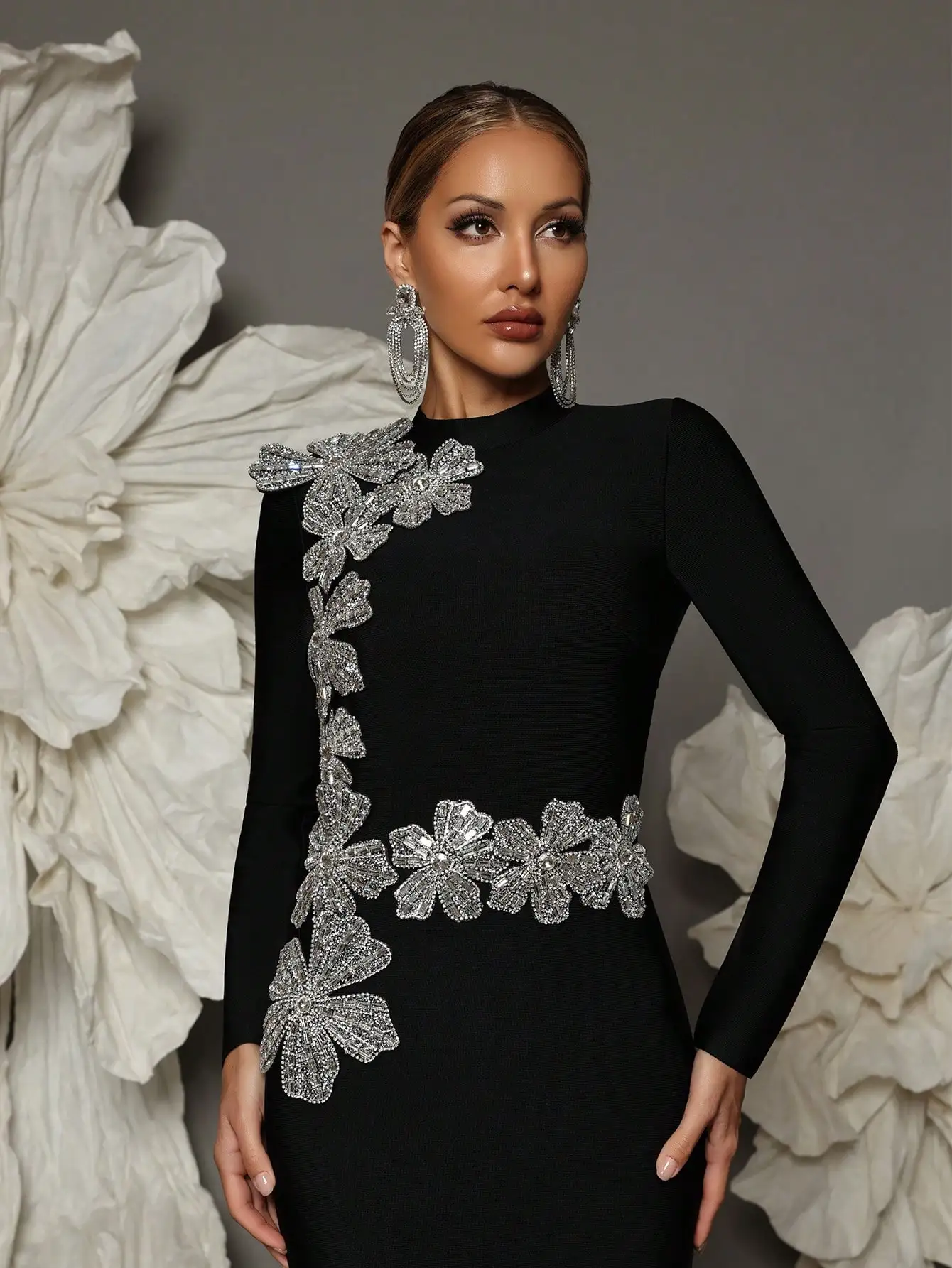 Black Long Sleeve Bodycon Dress with Silver Floral Embellishments, Elegant Evening Wear