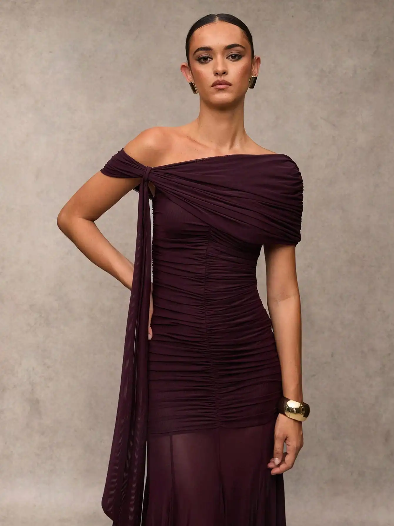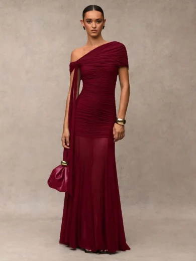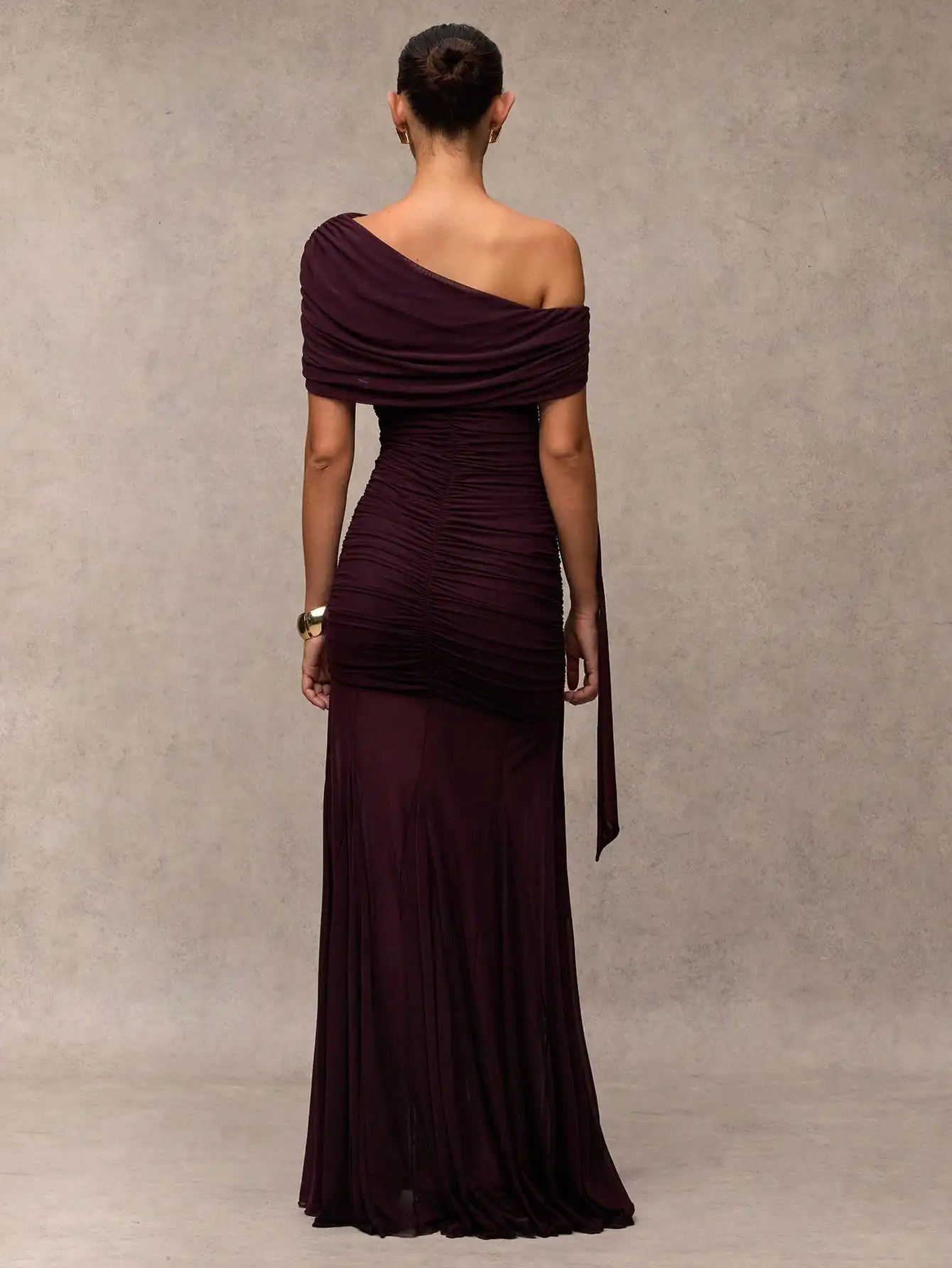 Burgundy One-Shoulder Ruched Gown with Flowing A-Line Skirt