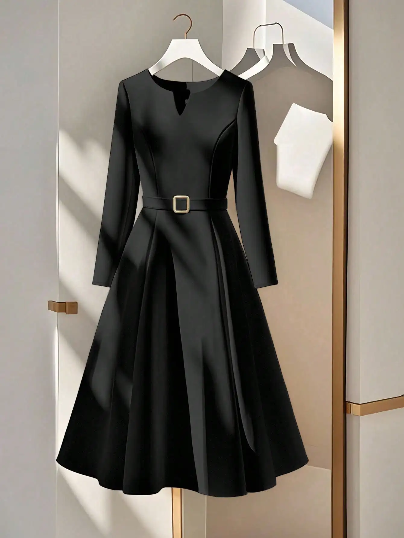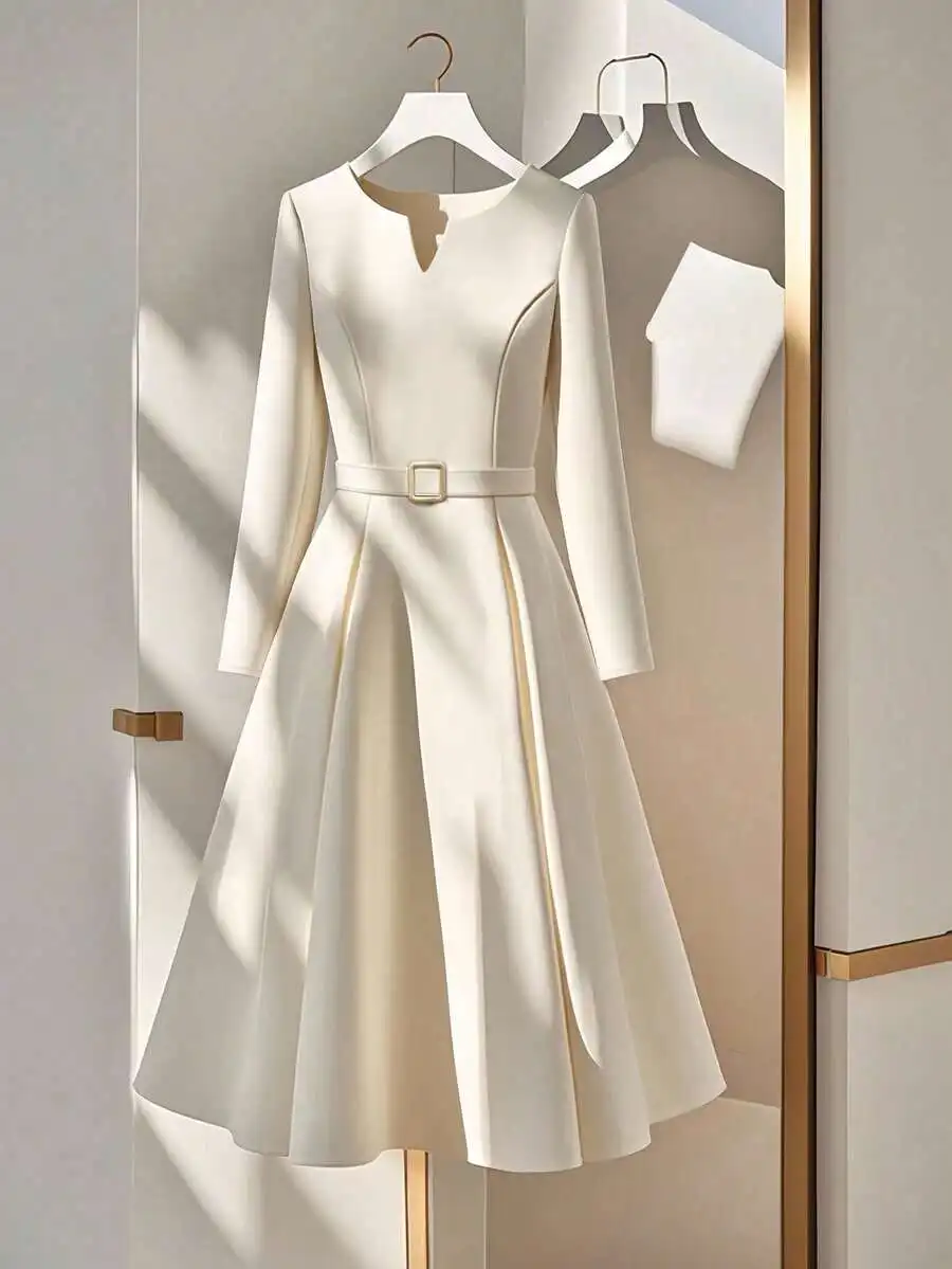 Elegant Cream Long Sleeve A-Line Dress with Metal Buckle Belt