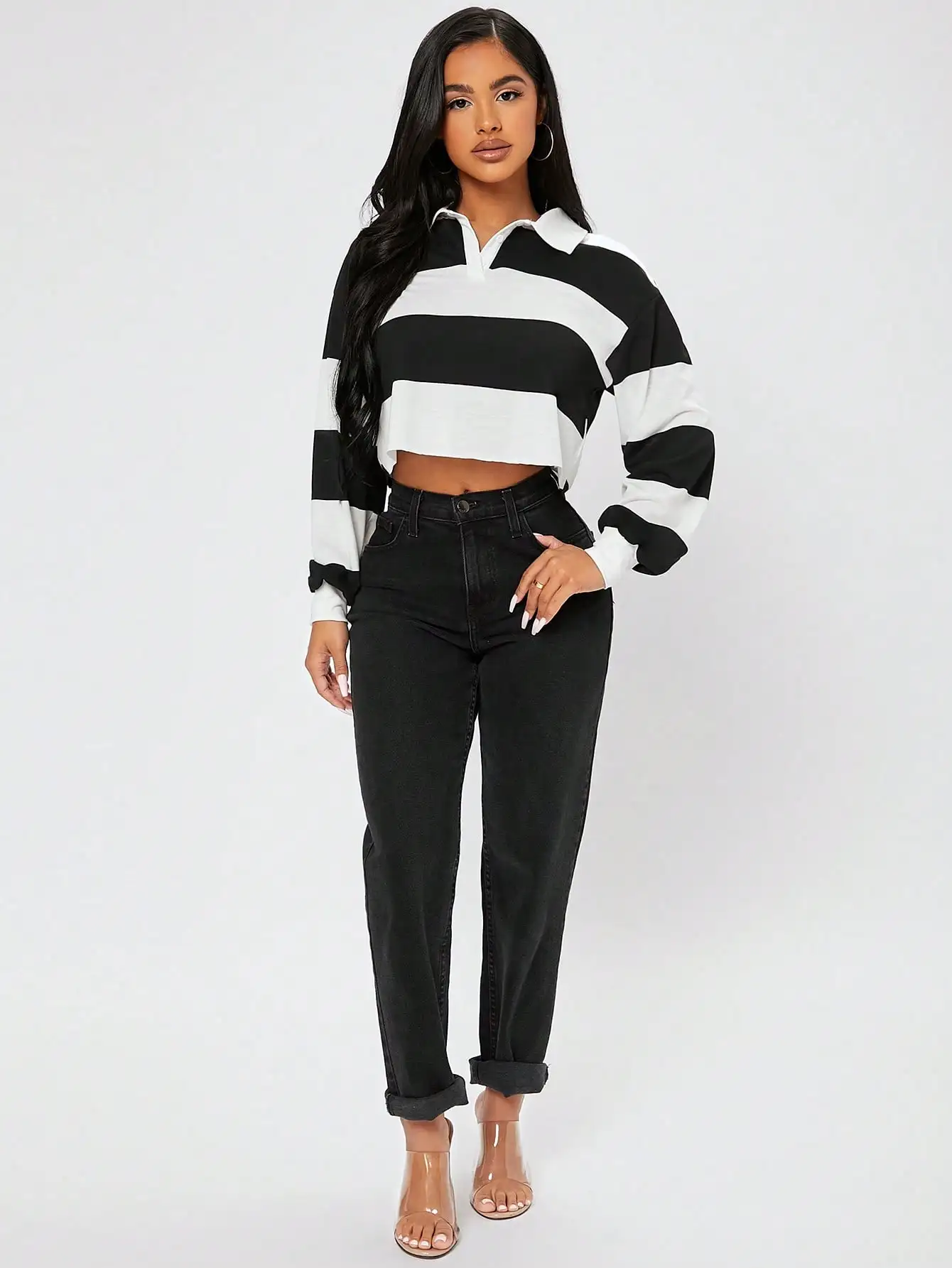 This cropped polo top features bold black and white horizontal stripes with a relaxed drop shoulder silhouette. Designed with a classic collar and half-button placket, it offers a modern streetwear vibe. The long sleeves and ribbed cuffs add structure while maintaining comfort. Perfect for casual spring outings or layering over high-waisted jeans.