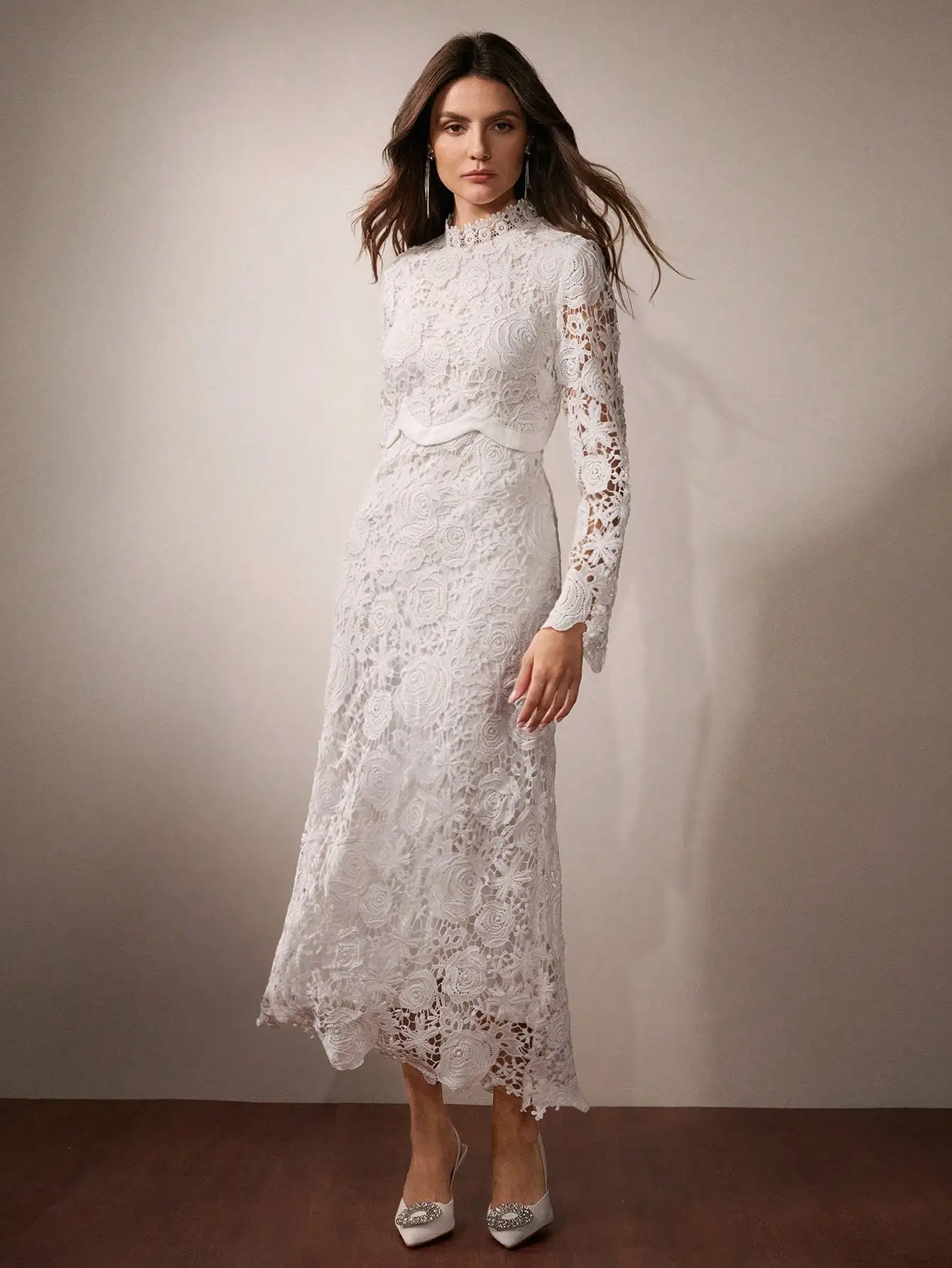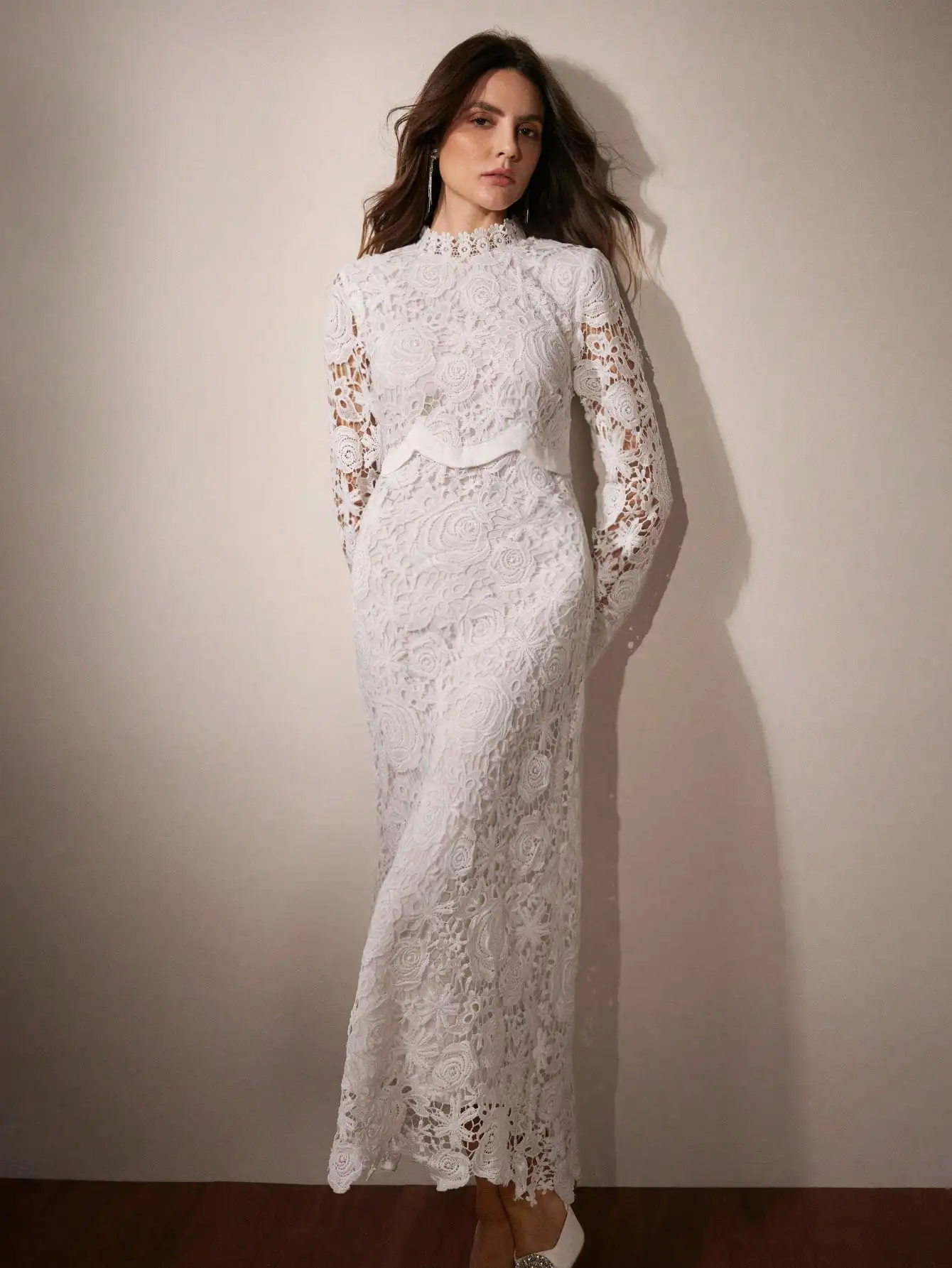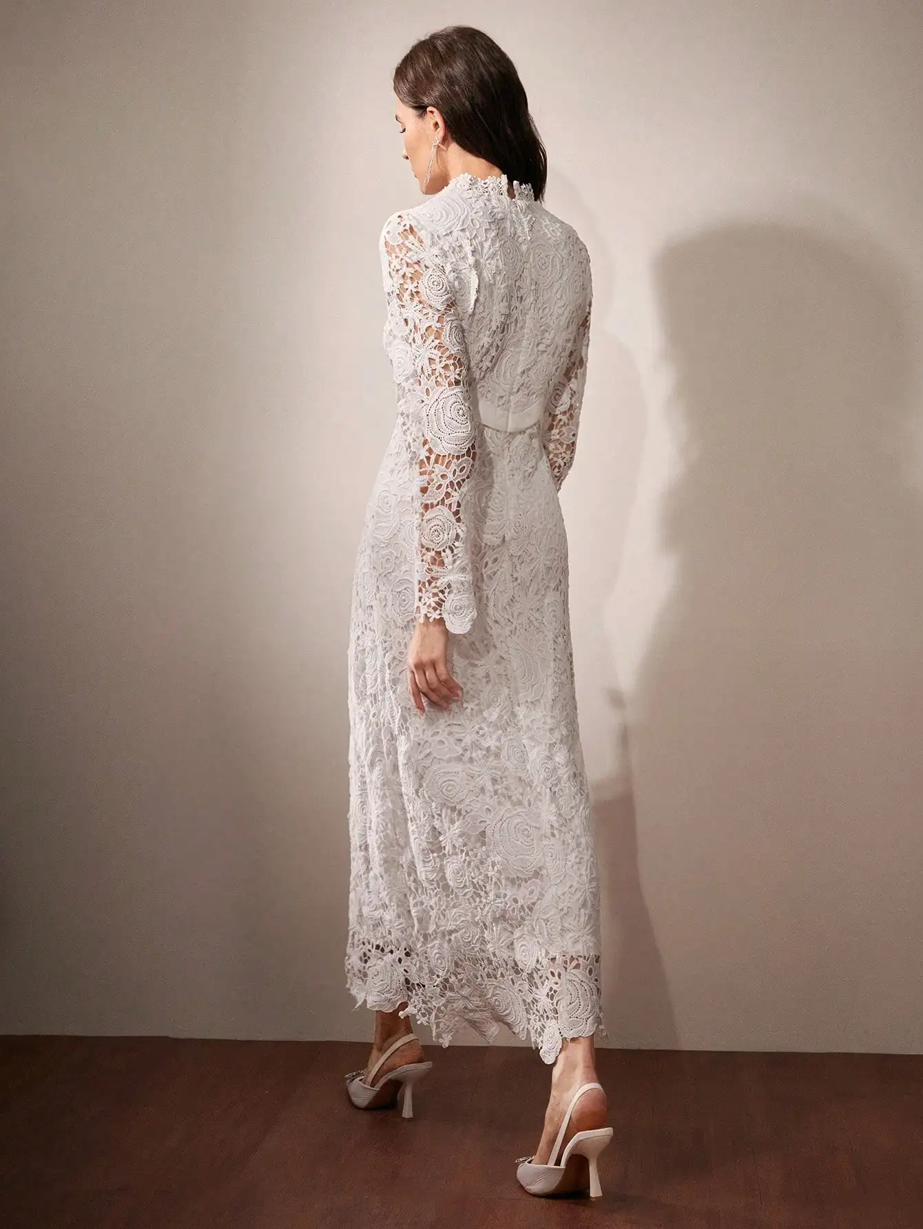 Women’s White Floral Lace Long Sleeve High Neck Midi Dress